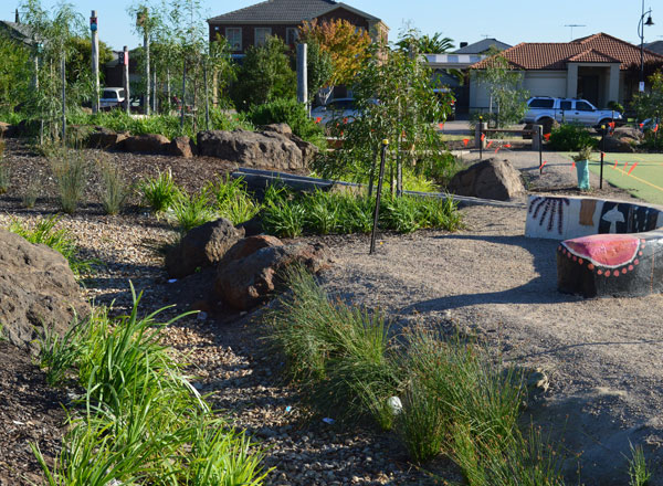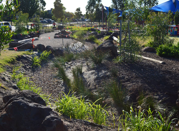 This project captured the imagination of the entire school community with huge contributions from many parents and friends of the school. Successive Stella Maris Gamily Fun Days and a $5000 CUA Community Care Grant helped generate funds for the project. Infinity Landscape Architects’ Scott Munro worked closely with the school principal and school partners to design and implement a major landscaped swale system through the school grounds. The meandering swale receives water from a section of the school roof as well storm water run-off from the grounds.